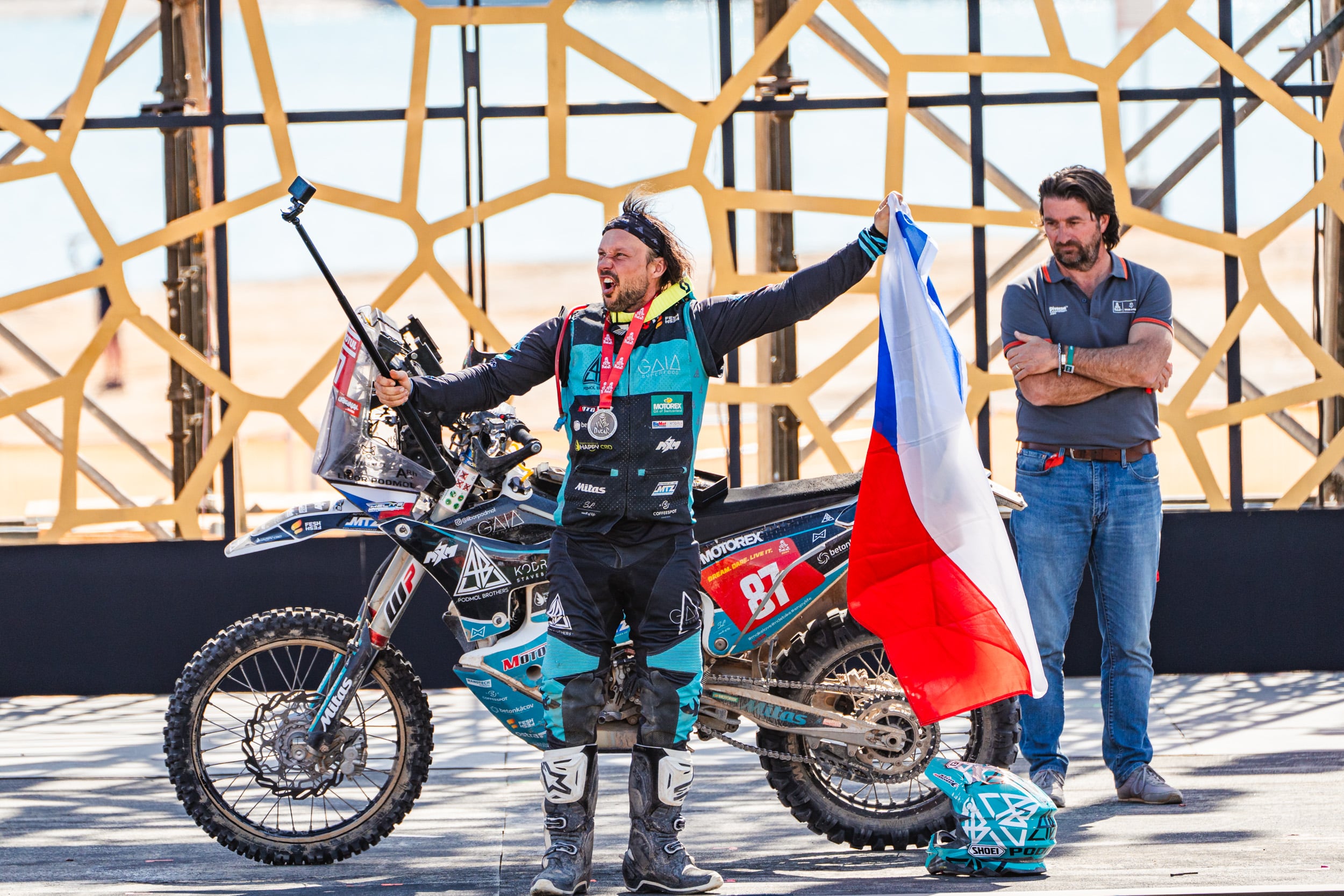 Je jedním z výrazných hrdinů letošní Dakarské rallye. Stačí jen zrekapitulovat, čím vším prošel a přičíst k tomu desítky hodin práce na motorce v bivaku. Ale to hlavní – Libor Podmol je v cíli letošního extrémního ročníku. Se šrámem nad okem, potlučeným tělem, vyřízenými rukami, bez druhého a možná už i třetího rychlostního stupně. Po roce 2021, kdy dojel na 31. místě, dokončil svůj druhý Dakar. V celkovém pořadí je na 53. místě, v kategorii jezdců bez asistence skončil osmý.