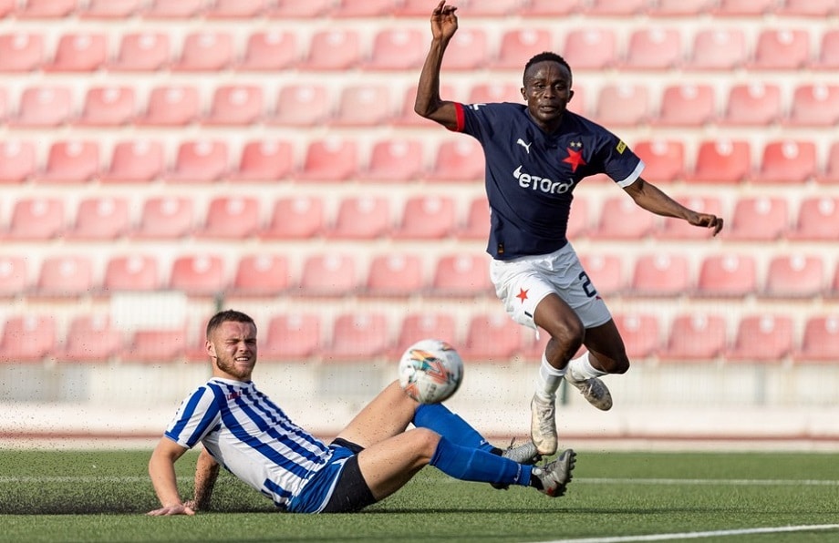 Kvalitou je tým Slavie oproti trpaslíkovi z Gibraltaru o několik levelů jinde a bylo to znát hned od začátku. Nejprve ve vápně Traoré naservíroval Sorovi, který míč uklidil do sítě. O 11 minut později jsme mohli vidět nigérijskou spolupráci, když Usor připravil míč Sorovi, který přidal svůj druhý gól v zápase.